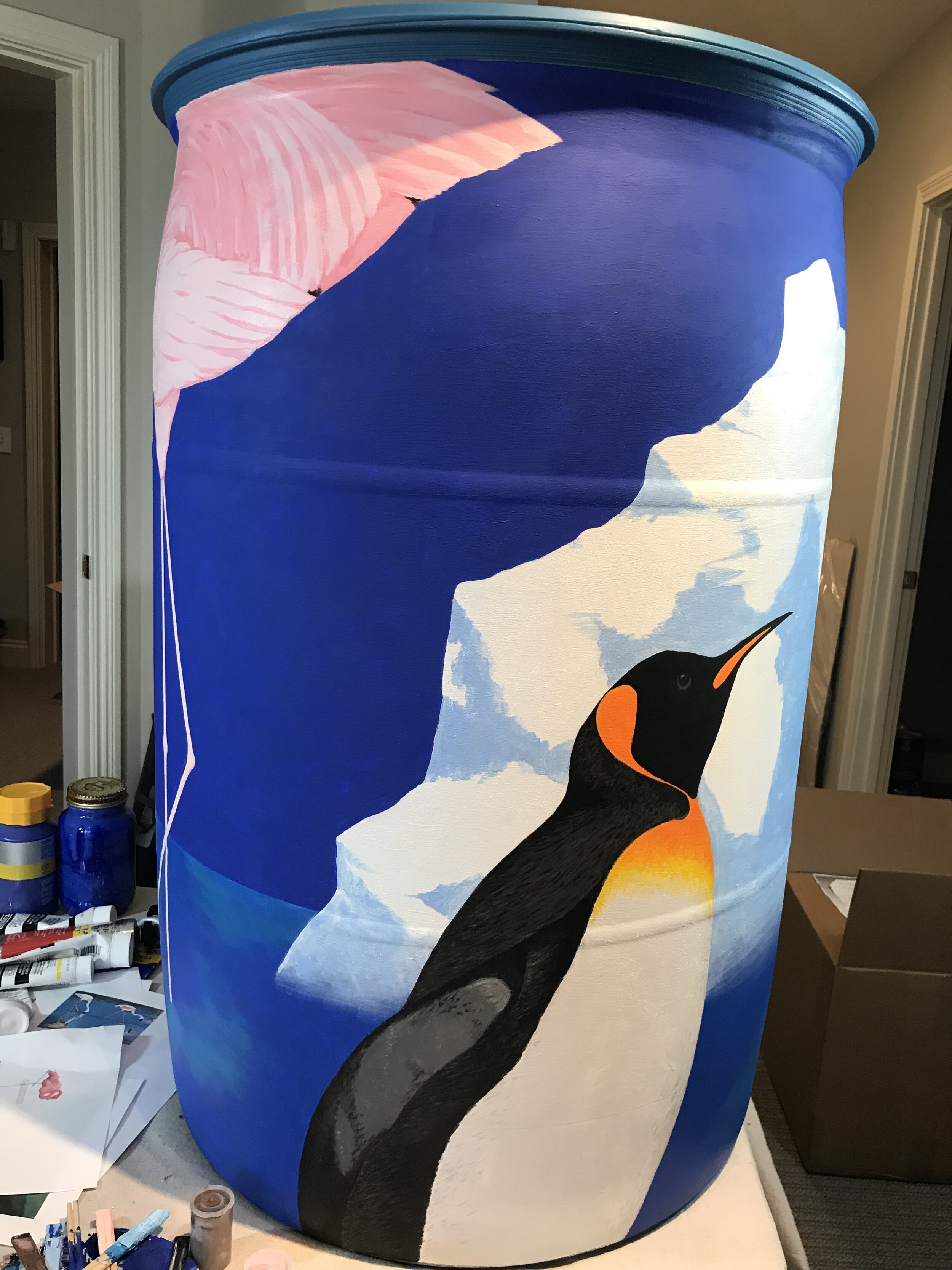 Fifty-five gallon plastic rain barrel hand-painted with hippo, flamingo and penguin in water-themed environments.