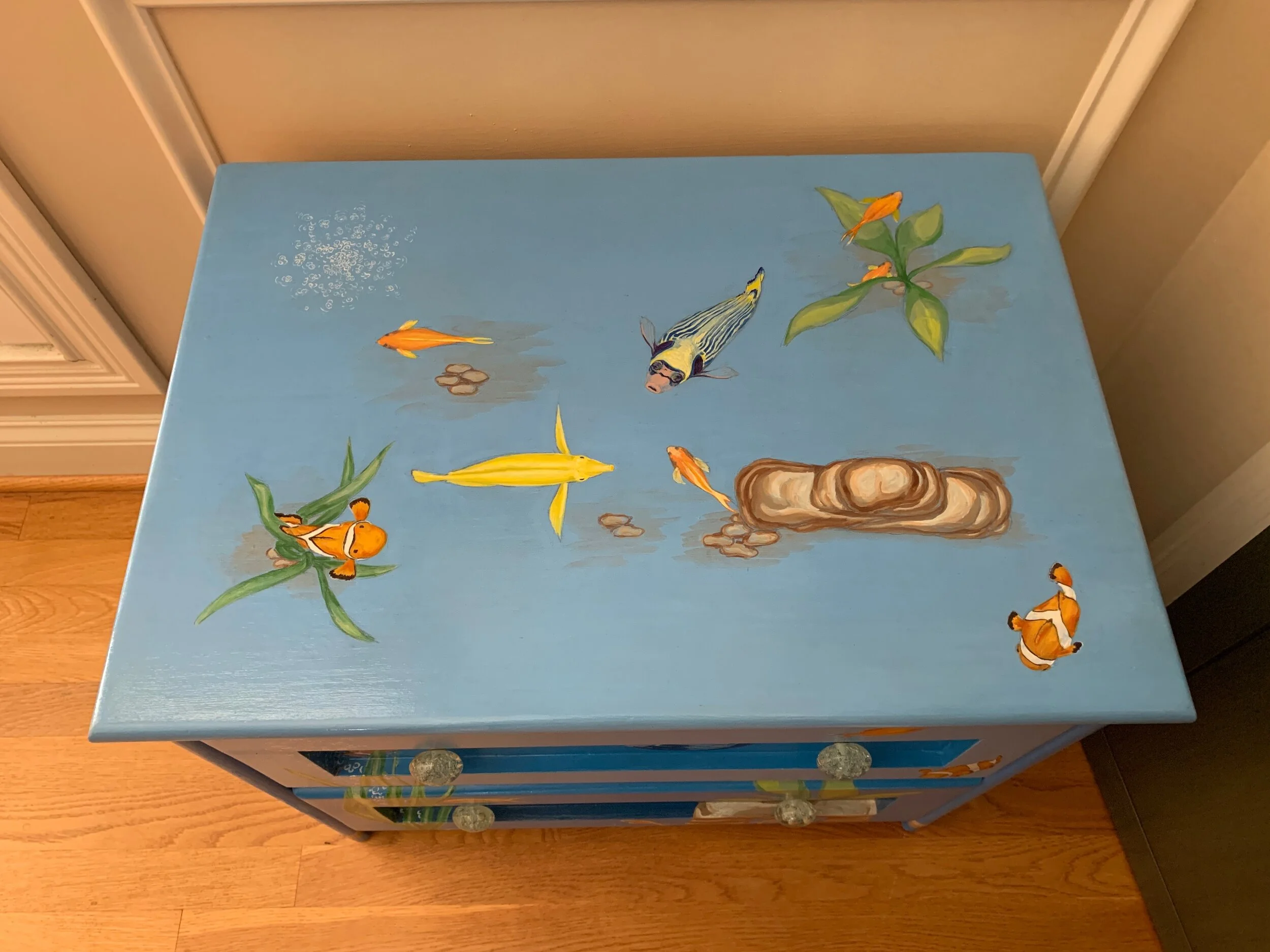 Aquarium with fish, plants, rocks and bubble stream hand-painted on two-drawer pinewood chest.